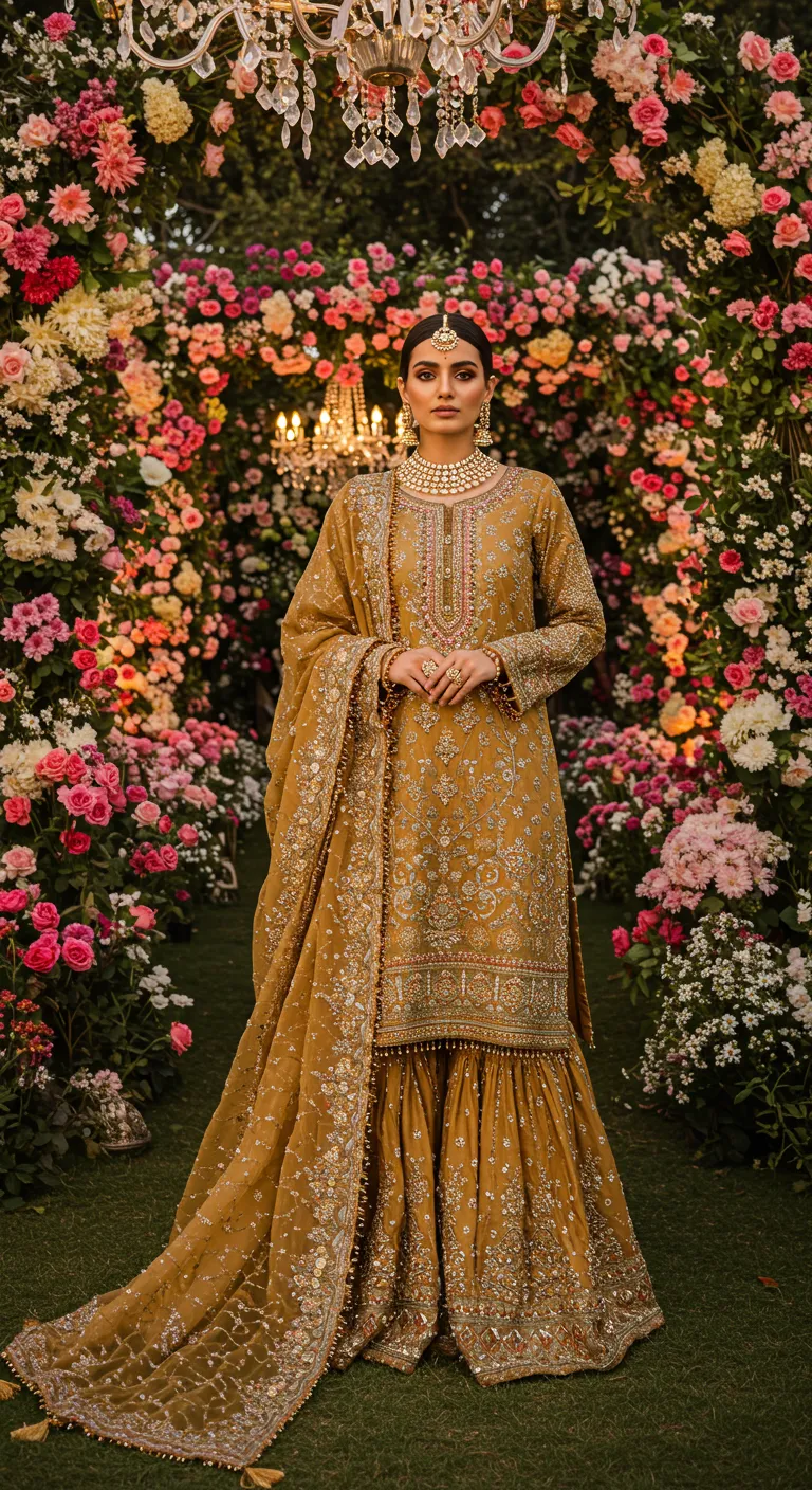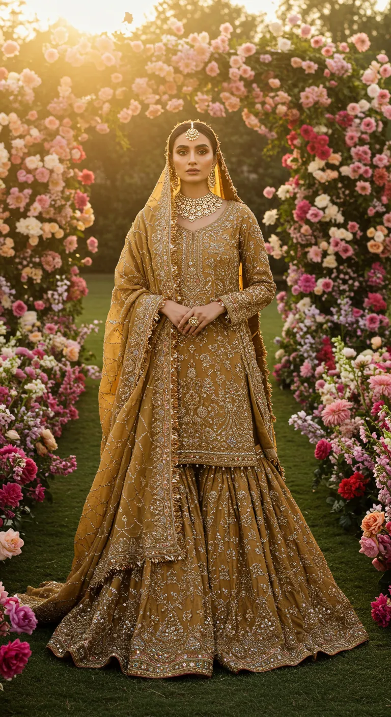 “Amber Radiance” captures bridal fire in golden tones, where naqshi vines and pearls meet couture artistry. Dawood Apparel curates a bridal piece that blends timeless radiance with light elegance.