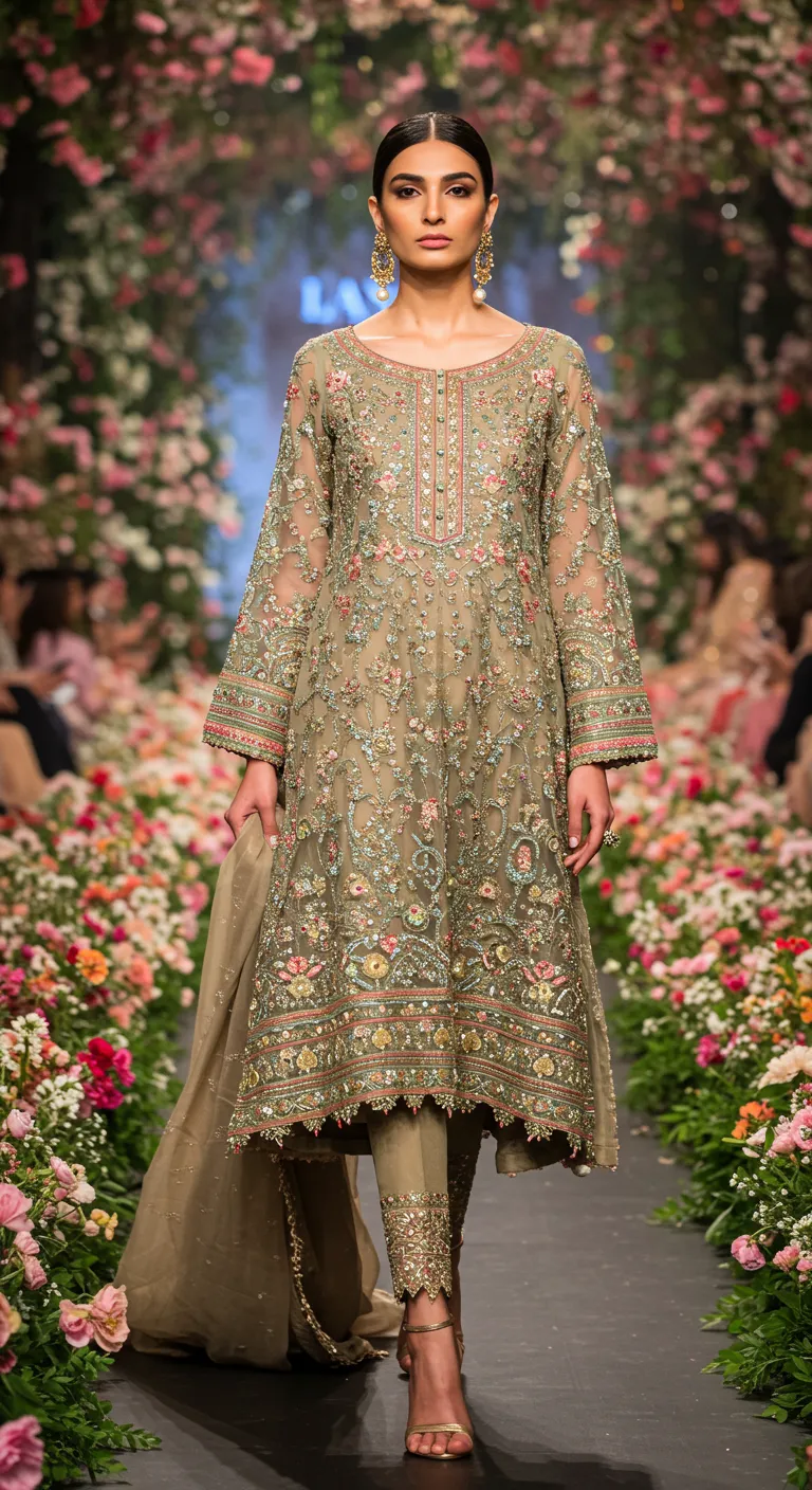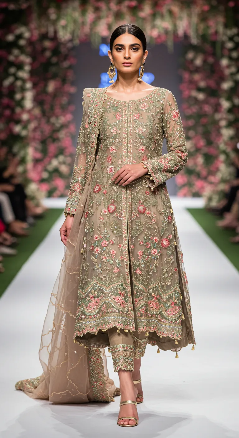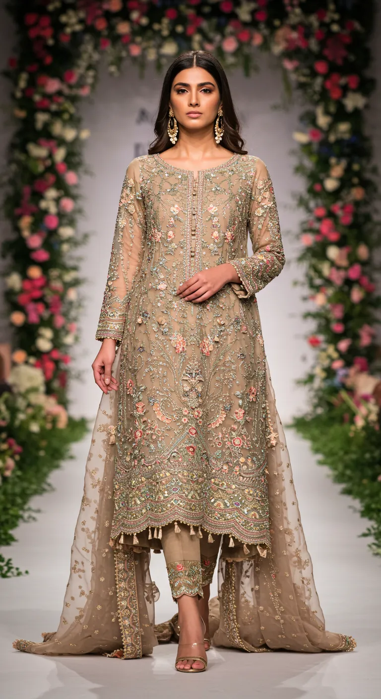 Blossoms stitched in light and lace, “Aurora Petal” blooms in airy organza. Dawood Apparel offers a frock that dances between youth and couture, radiant with sequins and pearls like petals under dawn.