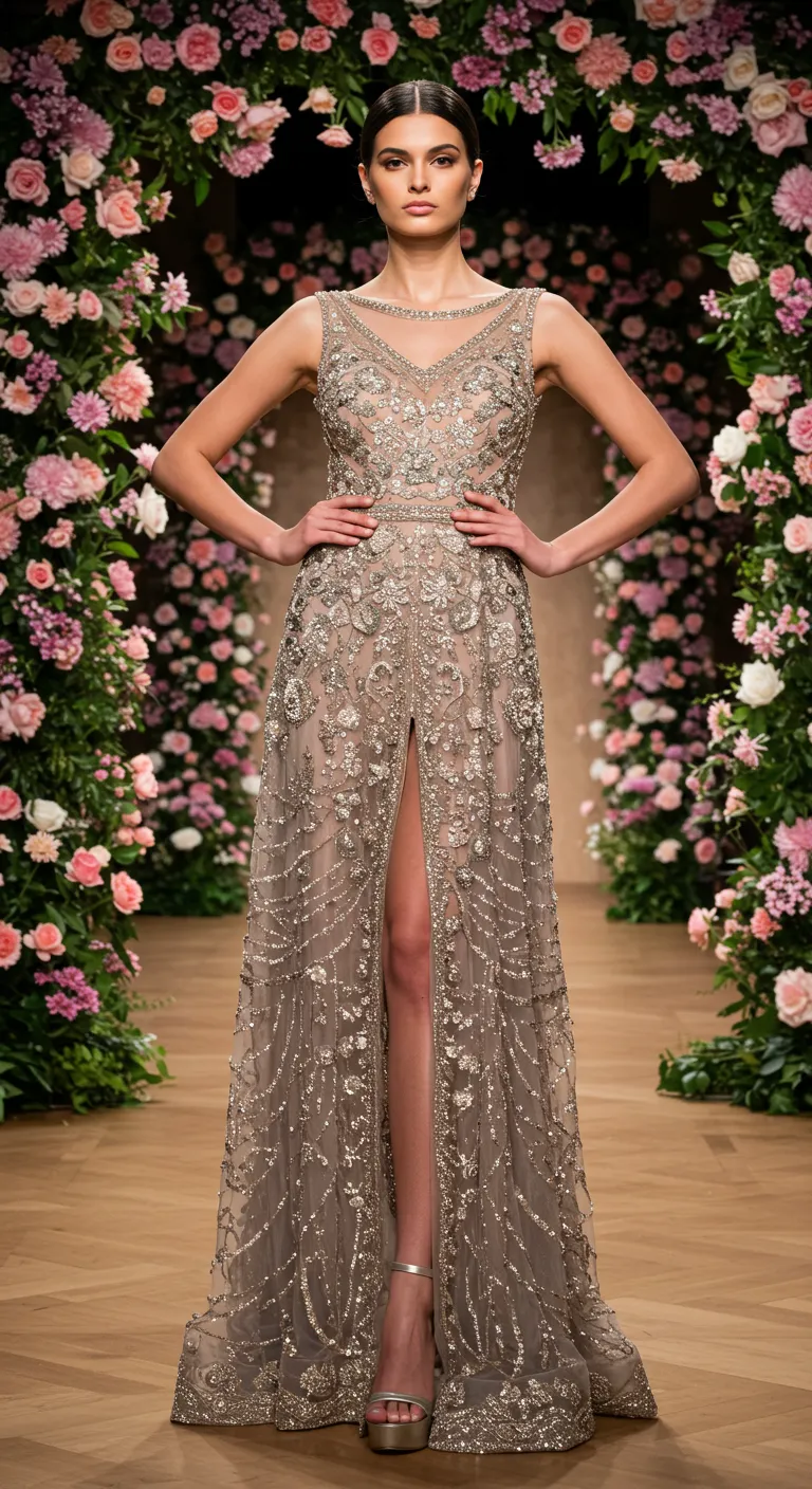 - Maxi: Soft blush organza maxi with pearl clusters and sequins vines.