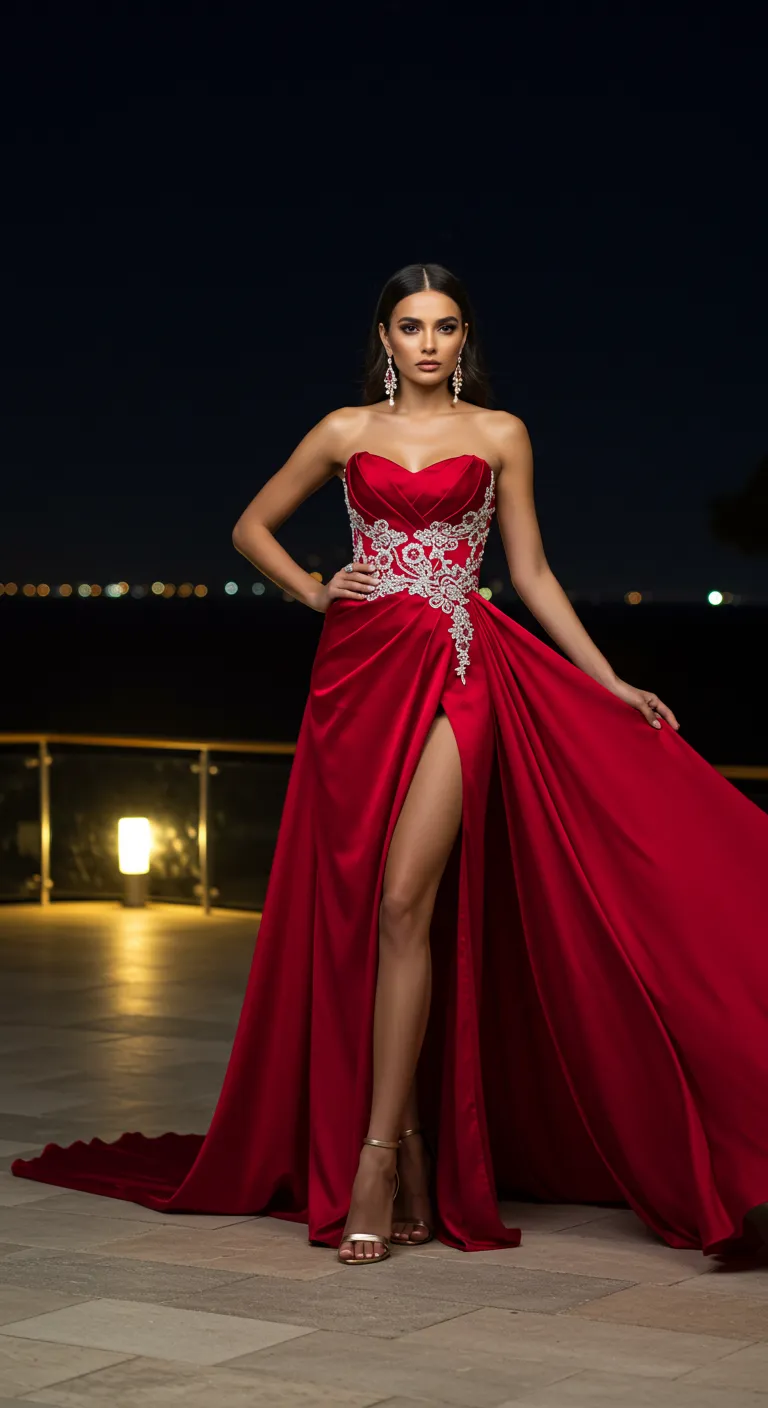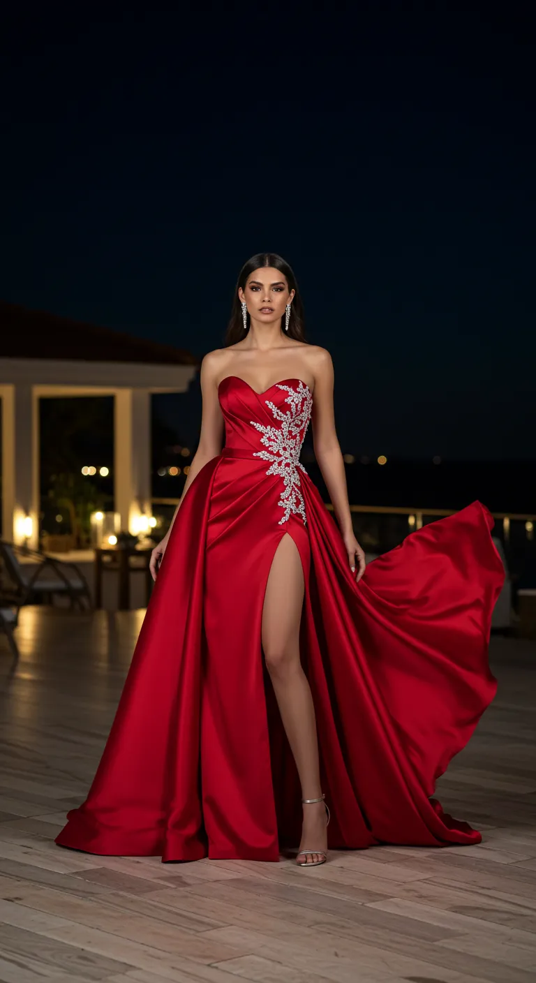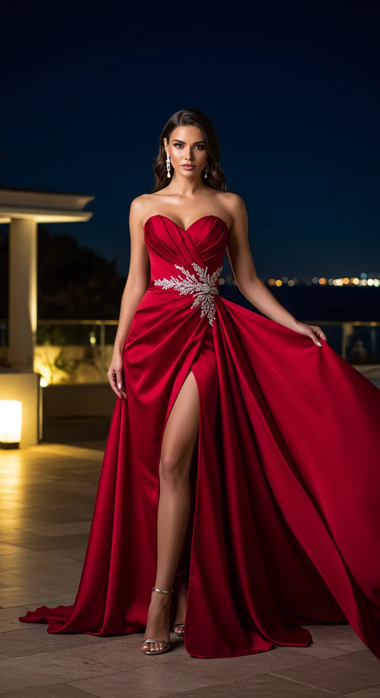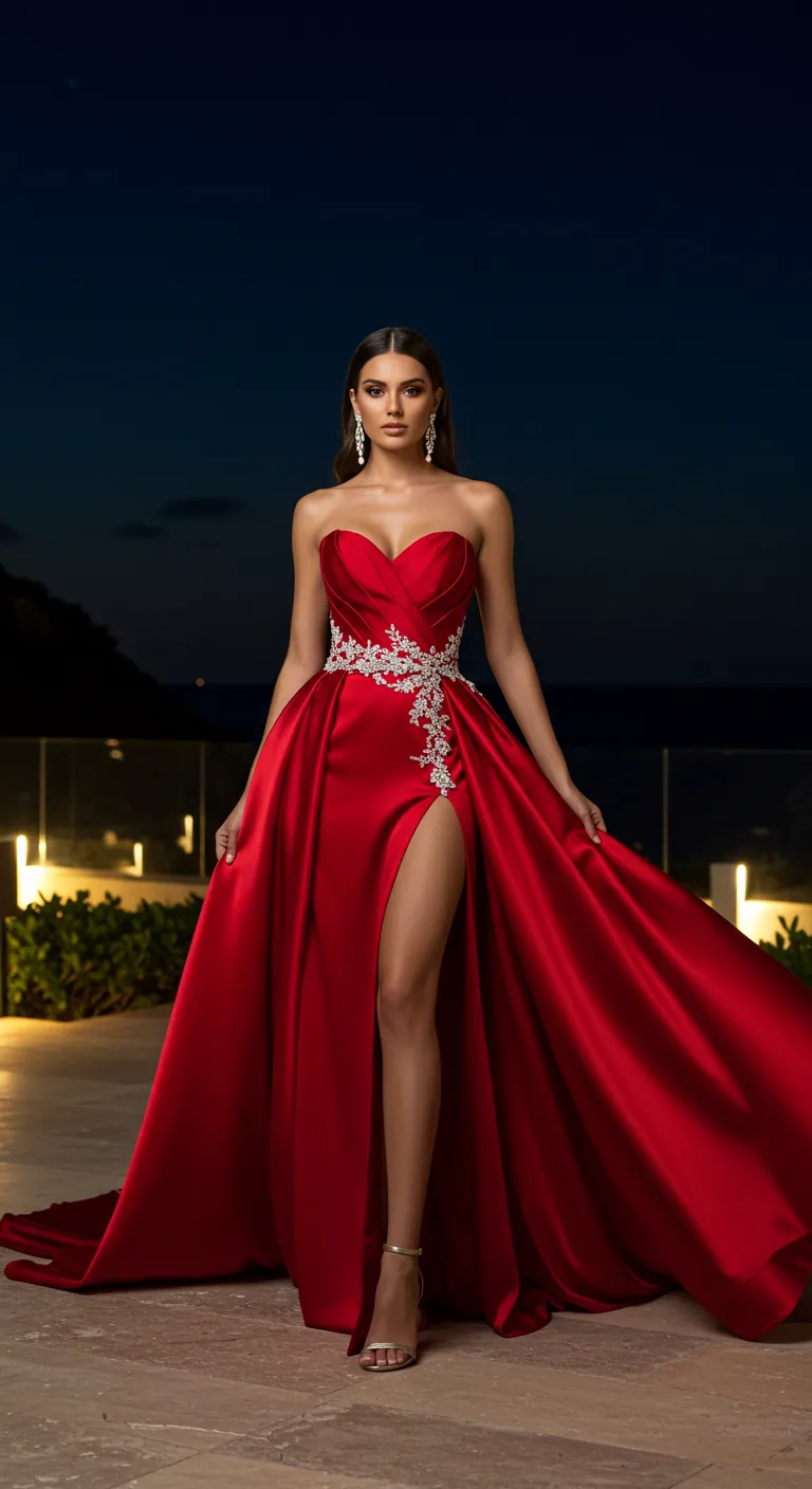 • Fabric: Flowing satin skirt with thigh-high slit and long trail