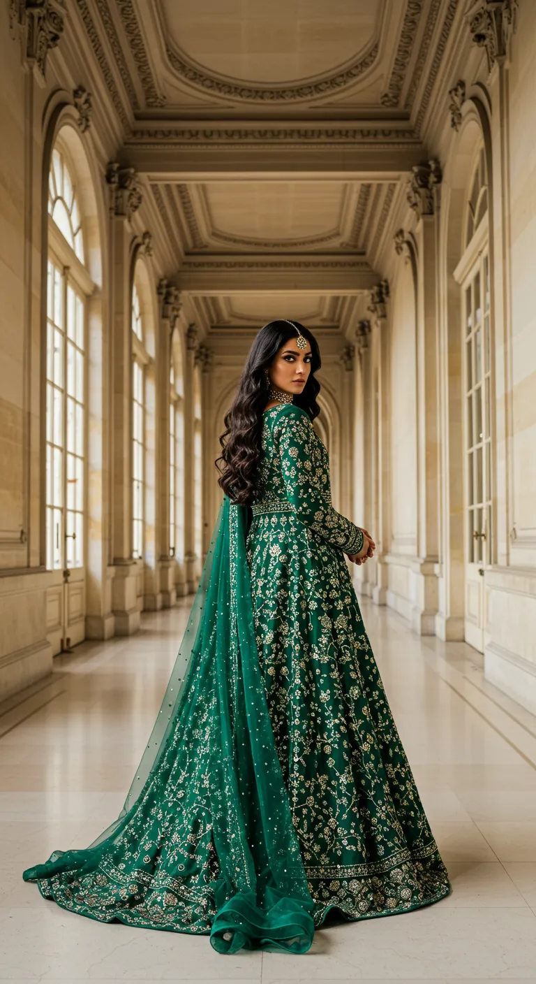 “Emerald Whisper” carries the essence of timeless royalty, where naqshi leaves and Swarovski glimmers whisper couture secrets. Dawood Apparel presents a bridal masterpiece in rich emerald tones.