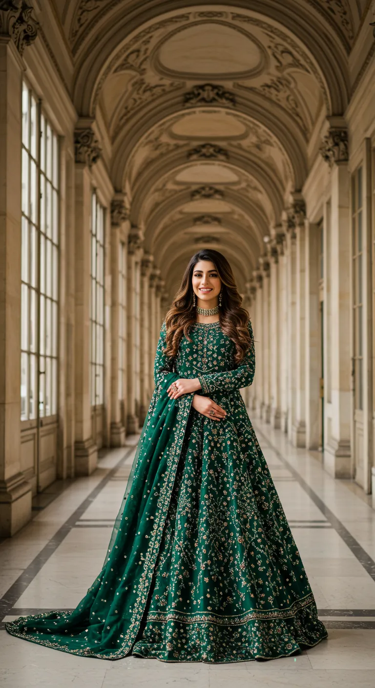 - Top / Maxi: Emerald chiffon maxi with naqshi-leaf embroidery and Swarovski sparkle neckline.