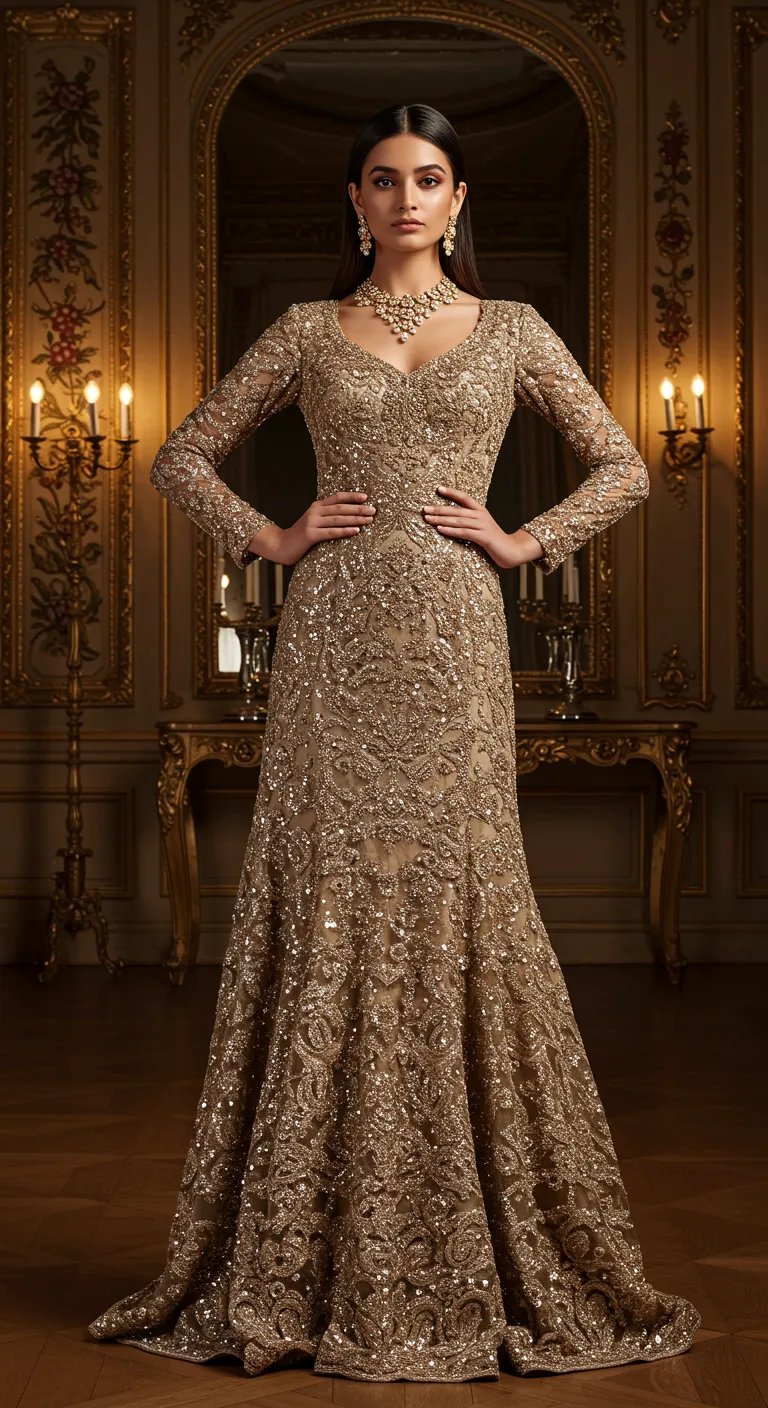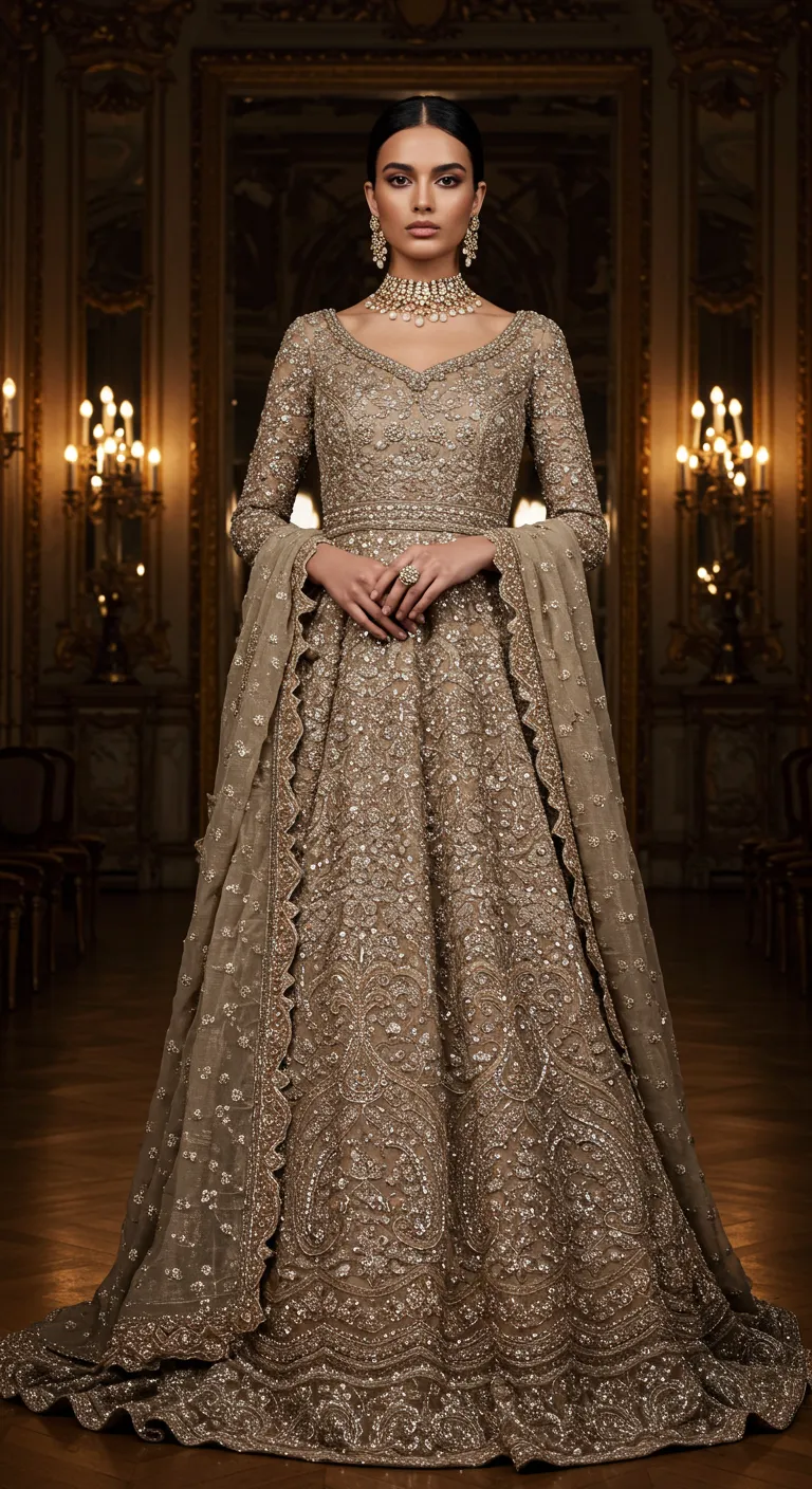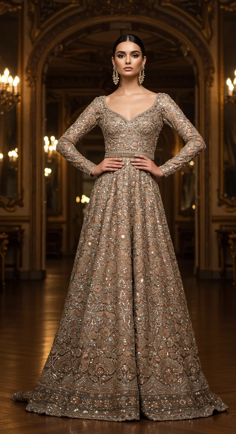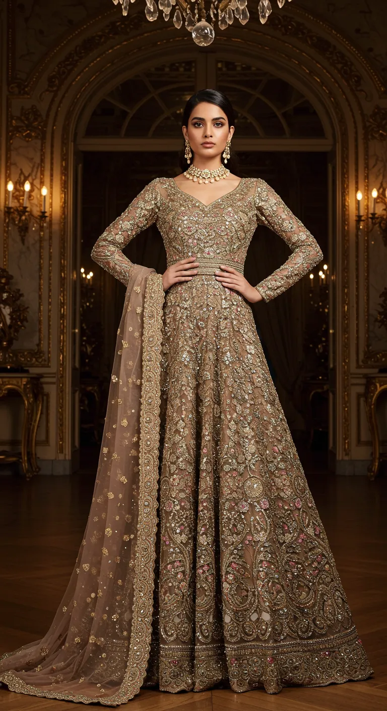 - Gown: Champagne-toned net gown with sequins and naqshi floral trails.