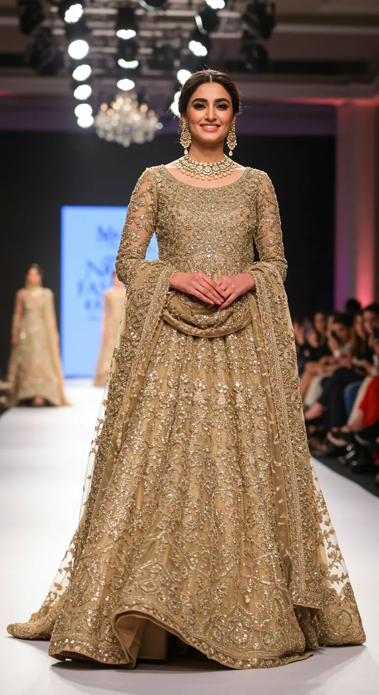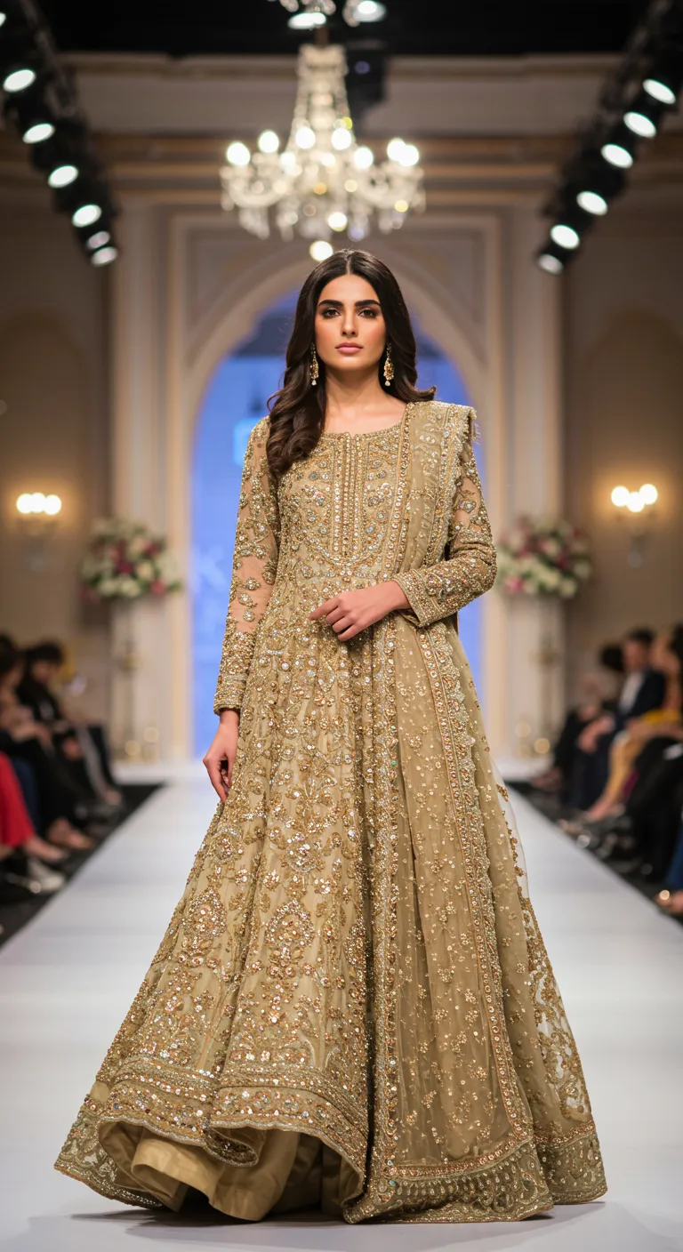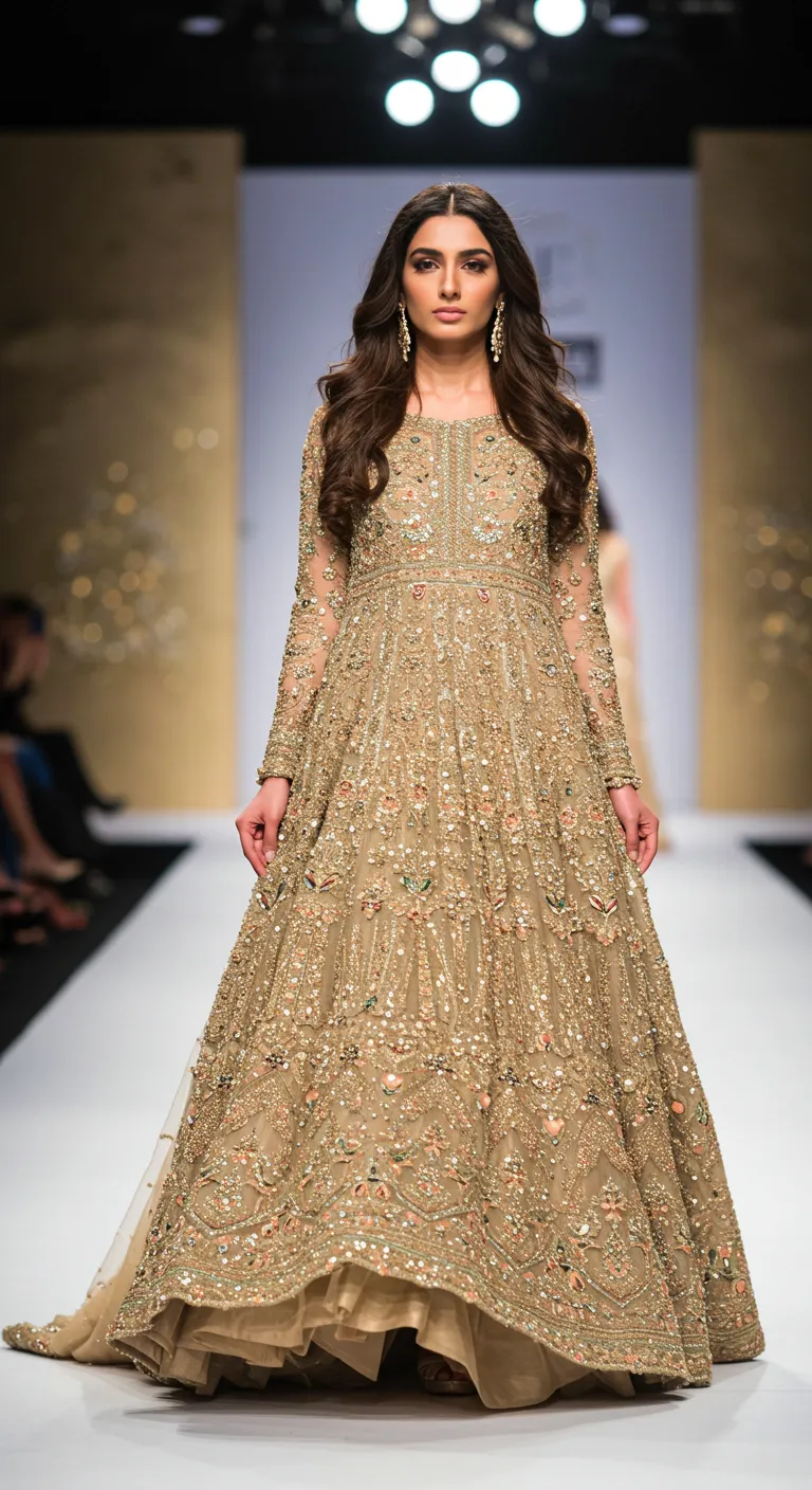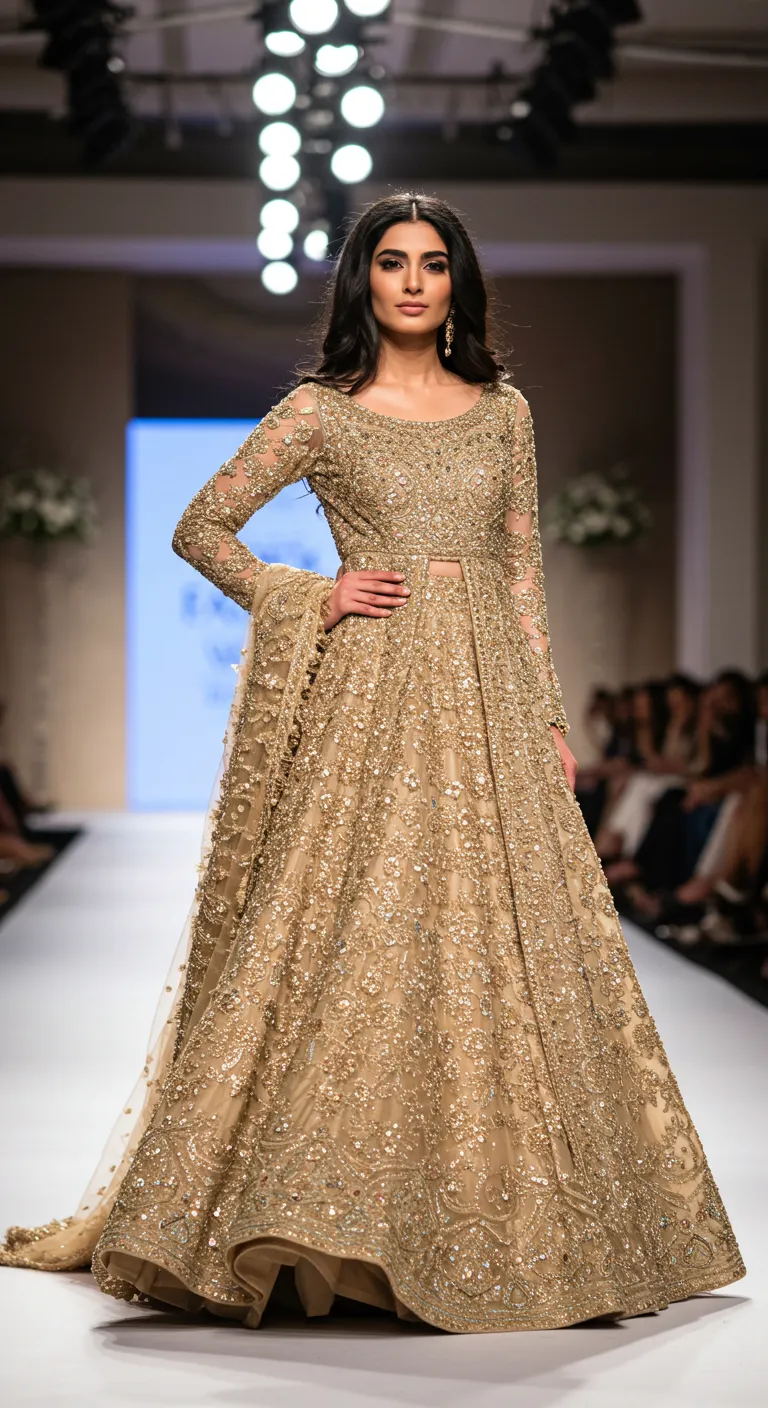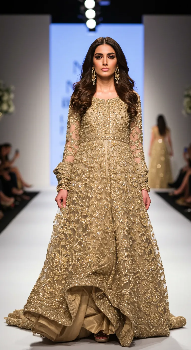 “Golden Echo” resonates with timeless couture notes, where cora blooms and Swarovski light create bridal poetry. Dawood Apparel captures golden sophistication in bridal artistry.