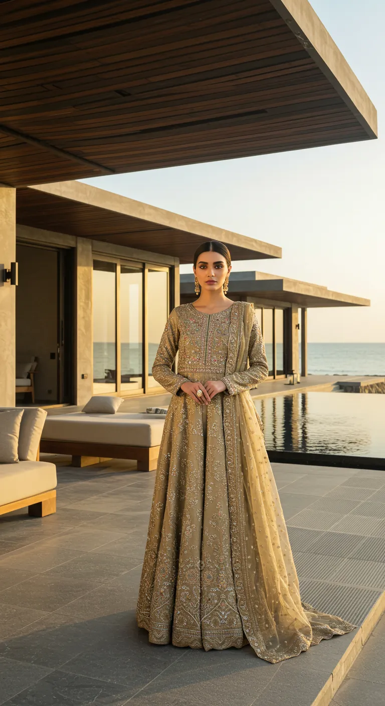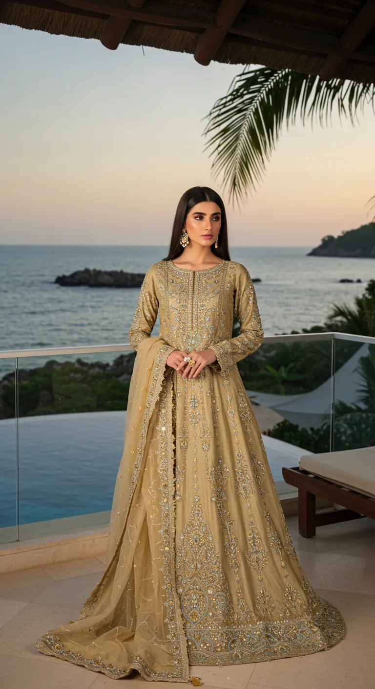 “Golden Mirage” blends coastal radiance with couture finesse, as Swarovski and naqshi weave stories of elegance. Dawood Apparel curates bridal artistry with an airy golden glow for the modern bride.