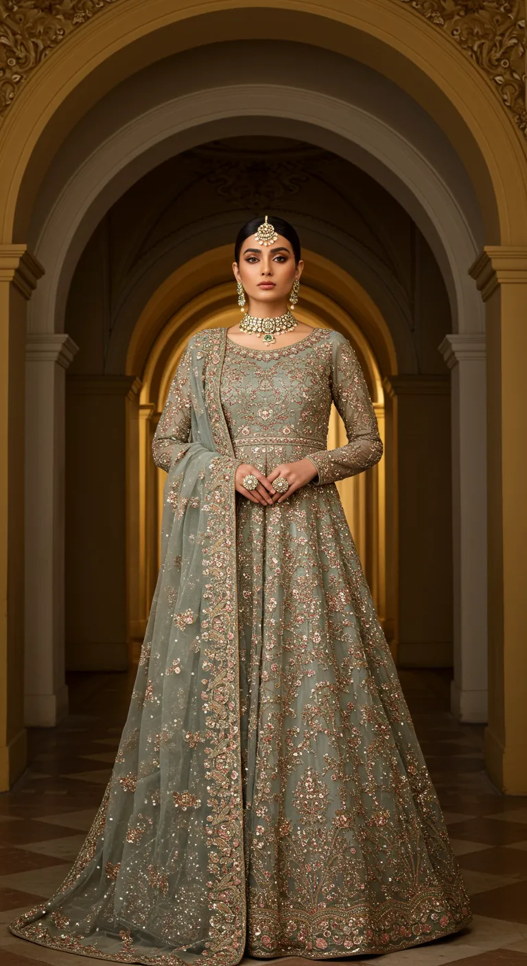 • Cape (Optional): Sheer organza cape with scattered sequins.