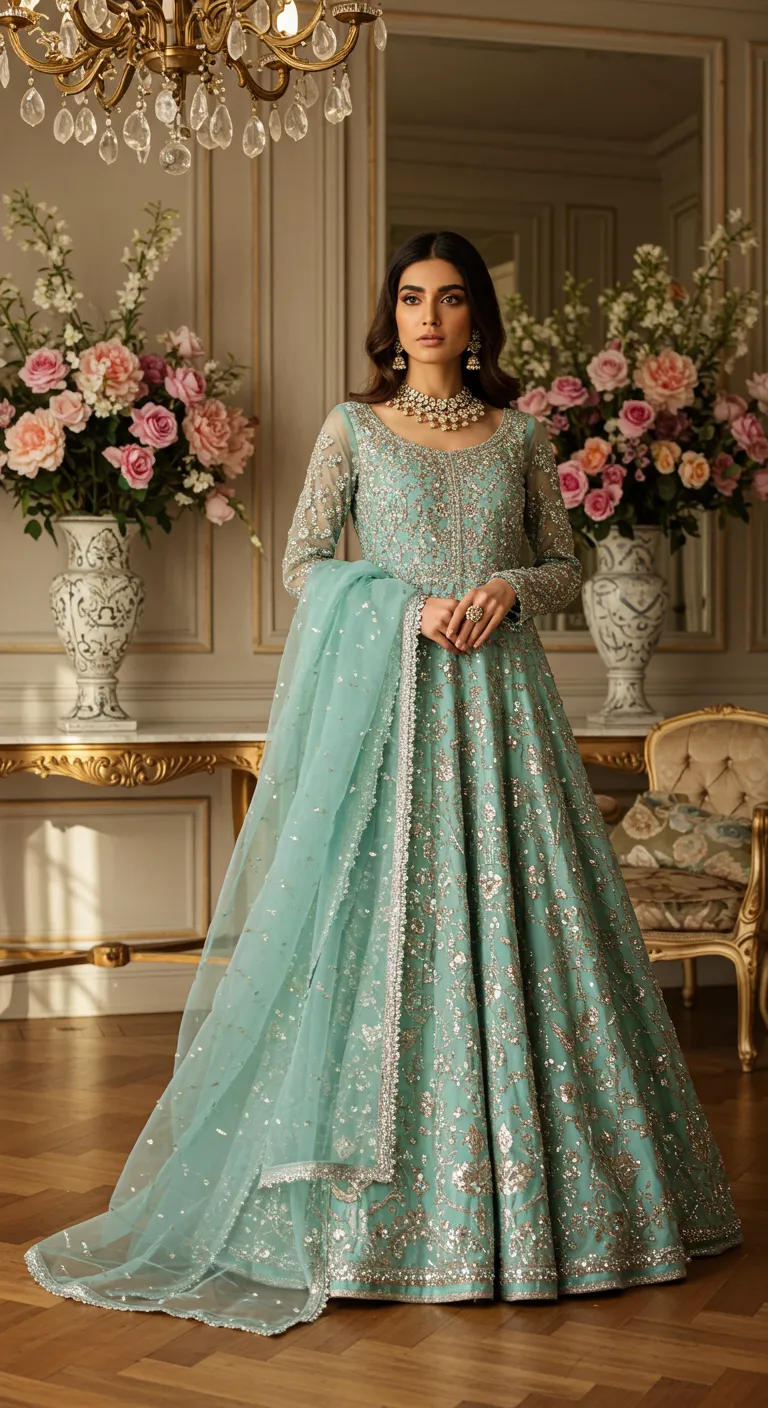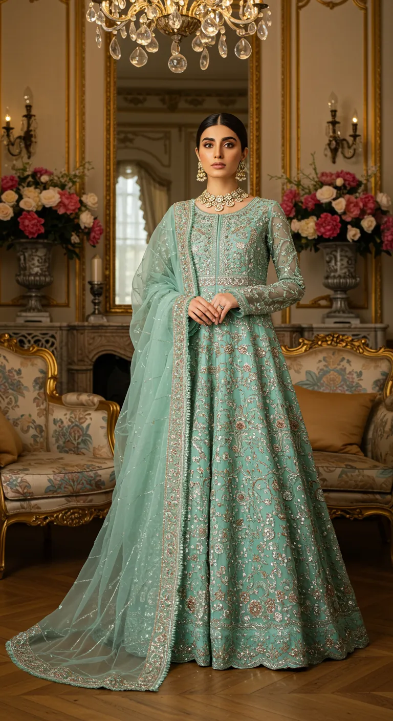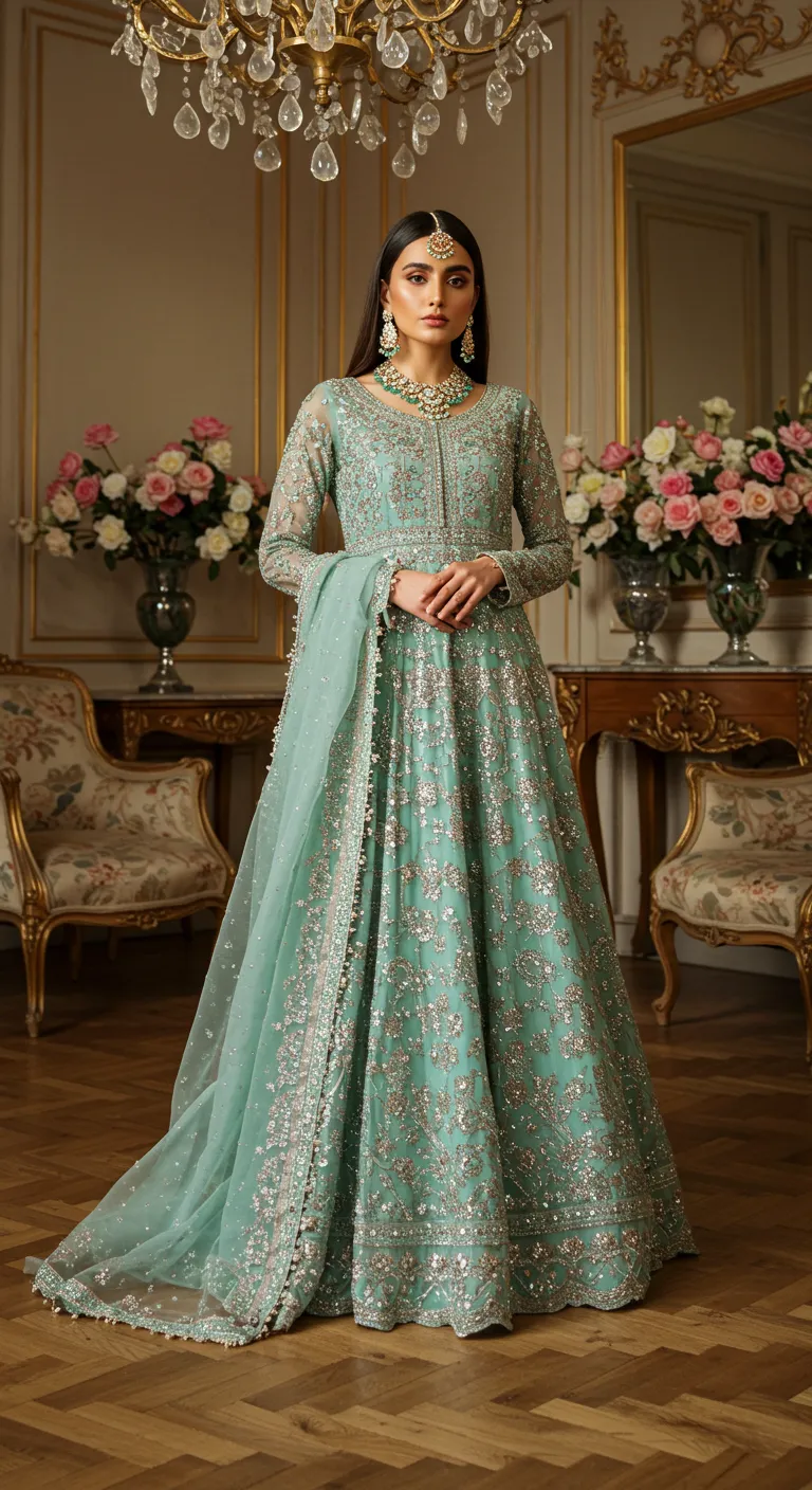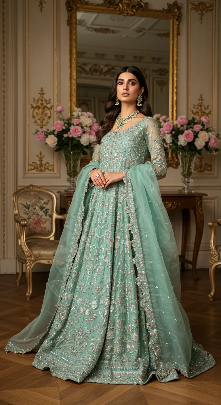 A whisper of moonlight woven into couture — Dawood Apparel’s “Moonlit Whisper” redefines soft glamour. Gentle embroidery and mint hues blend like poetry in motion, perfect for a serene Walima night.