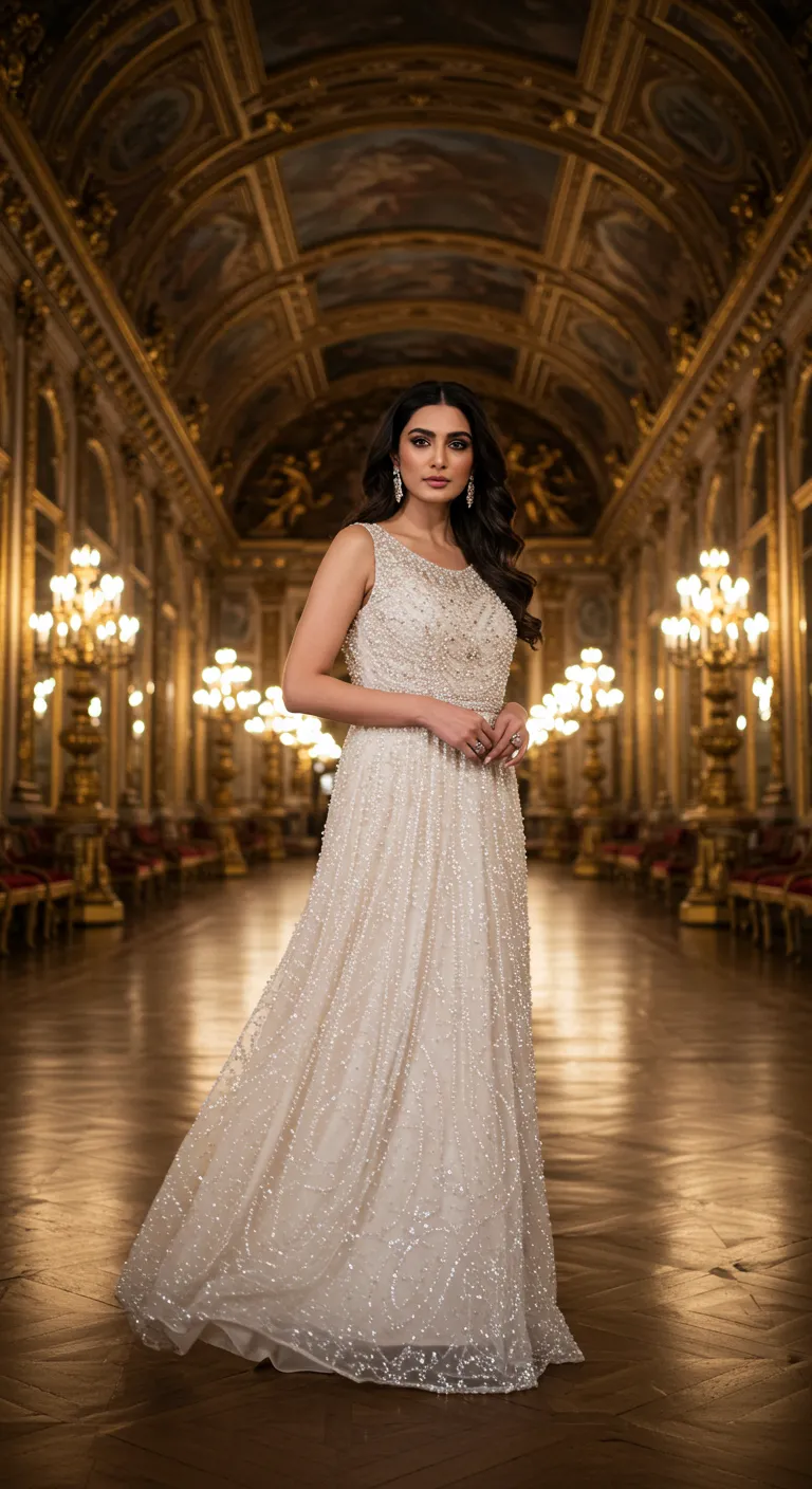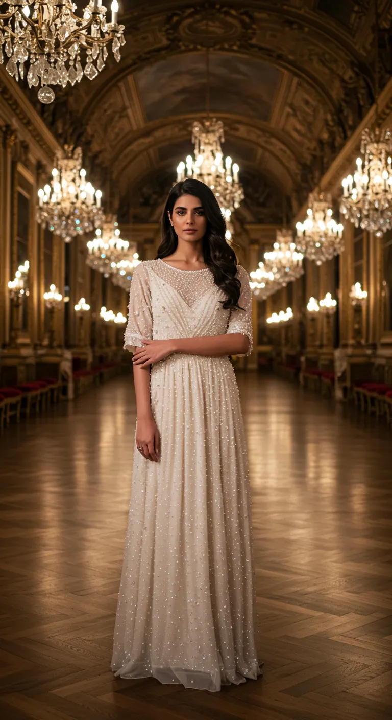 • Top / Maxi: Ivory chiffon maxi with pearl clusters on neckline, Swarovski spark scatter.