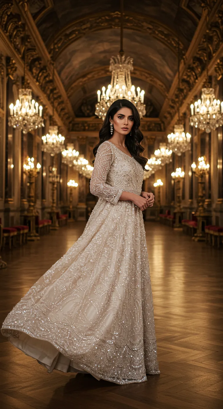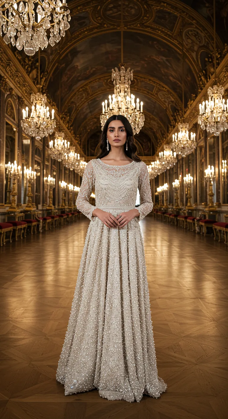 “Pearl Serenade” sings softly in ivory tones, where pearls and Swarovski notes create bridal harmony. Dawood Apparel brings couture romance in a melody of elegance.