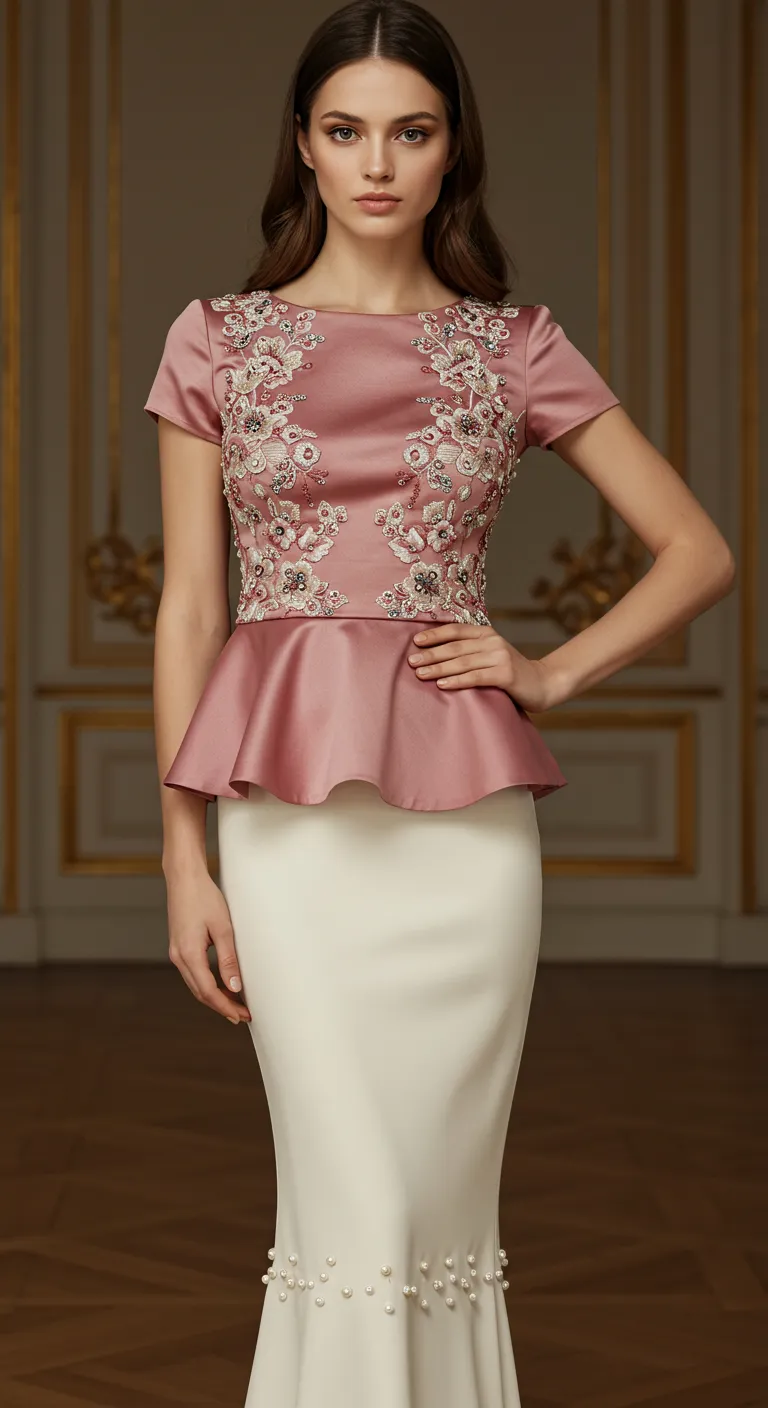 “Rose Étoile” by Dawood Apparel blends East and West — a peplum blooming with dabka florals above an ivory skirt kissed with pearls. Feminine, fresh, and couture.