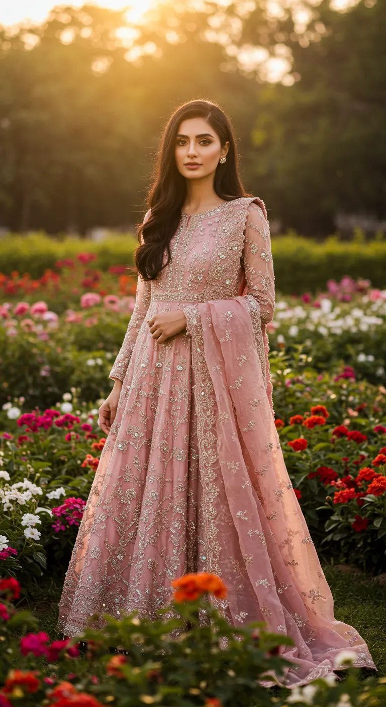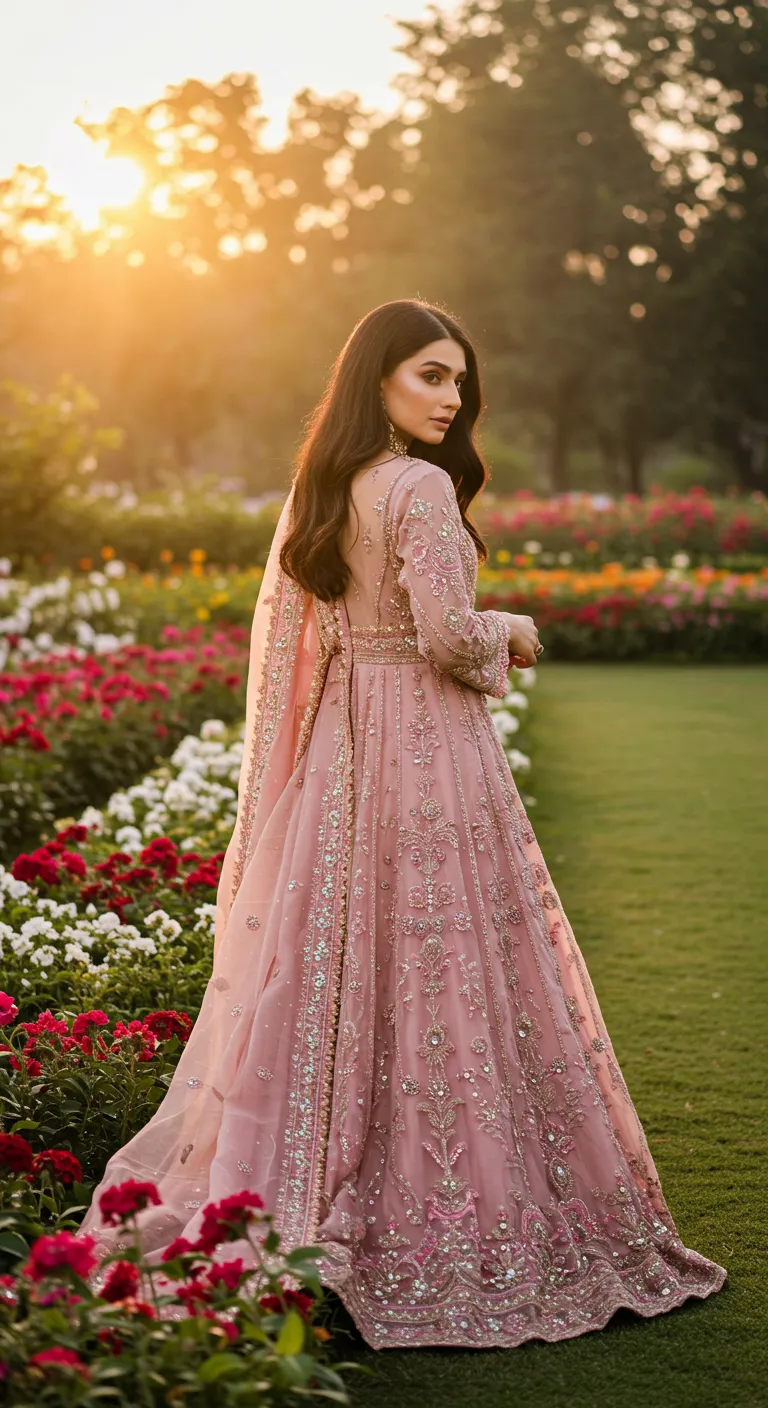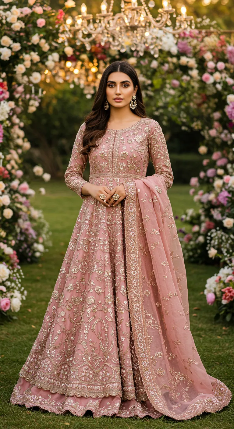 “Rosé Grace” blossoms with couture charm, where pearls and Swarovski petals meet in poetic harmony. Dawood Apparel curates a pastel bridal story full of light romance.