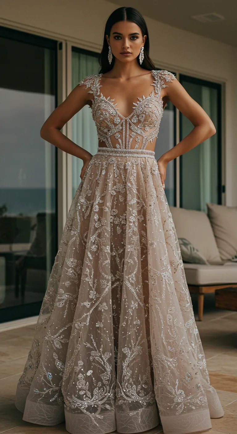 Bathed in oceanic hues, “Sapphire Whisper” unveils couture fluidity with Swarovski shimmer. Dawood Apparel creates a gown for evenings that shine with understated